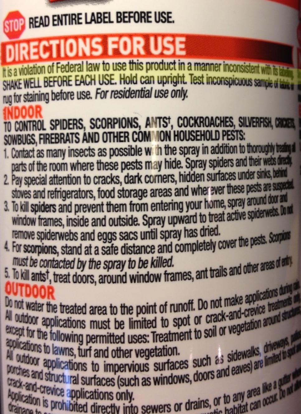 bug sprayTake a look at the highlighted portion of the picture. There you will read the following: “It is a violation of Federal law to use this product in a manner inconsistent with its labeling.” As any trained pest control technician would tell you, “the label is the law.”