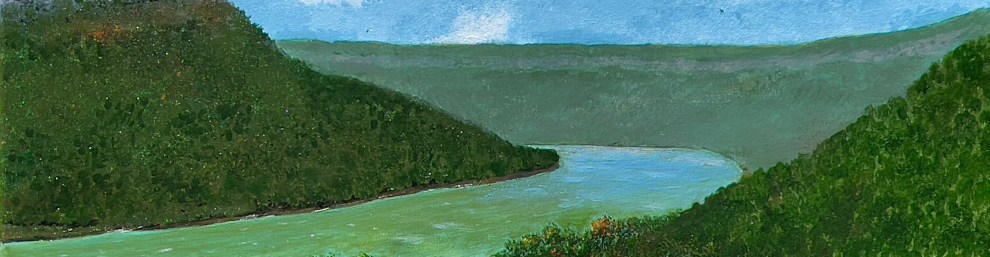 Below is a painting I just finished today. It’s a view of the river as might be seen from the front yard of our house. All I did was leave out houses and “progress” and imagined what it might have looked like 150 years ago.