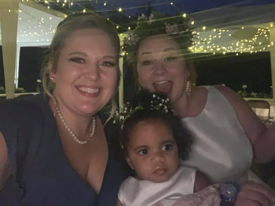 The oldest daughter of the father of the bride (Alicia), along with the bride and the granddaughter of the grandfather who’s the father of the bride (Emma).