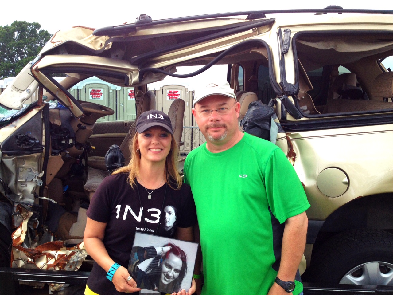 Tiki Finlayson and me. They carry the van around to show what happens when people drive intoxicated. The picture is of Kevin Yates, her son.
