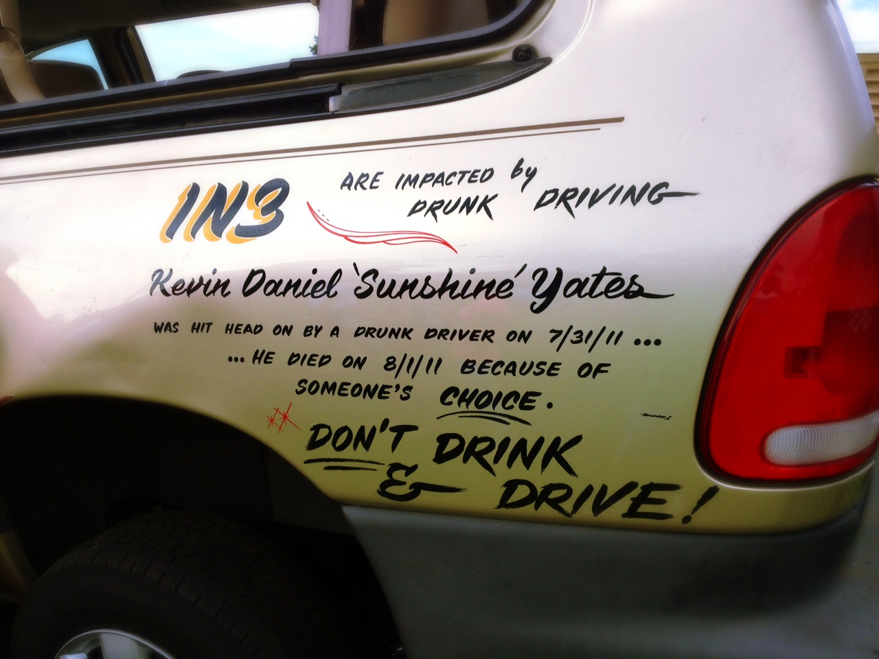 I would encourage you to go check out the website for 1N3, the ministry that Kevin’s mother and brother (Derek Yates) founded to increase awareness of the tragedy of drunk driving. There you can read the whole story of what happened, about Kevin, and about the lives that have been saved through organ donation. But for now, I would just like to share with you what Tom, Kevin’s dad, told me as we stood looking at the van Kevin was driving.