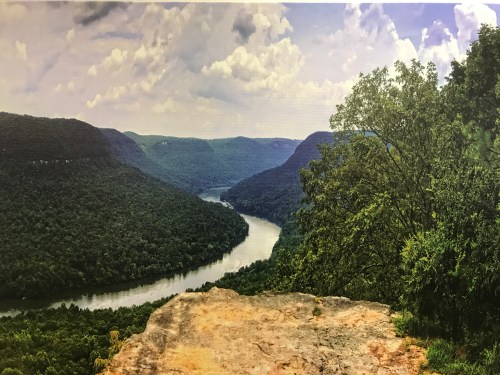 If you were to sit on the edge of the rock, to your left you would see the Tennessee River flow down from the direction of Chattanooga. Below your feet would be a hundred-foot drop to the tops of maple and oak trees. To your right would be (as you see here) the river on which we’d fish, ride in a boat, and watch the rains from every storm approach us like a white wall.
