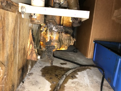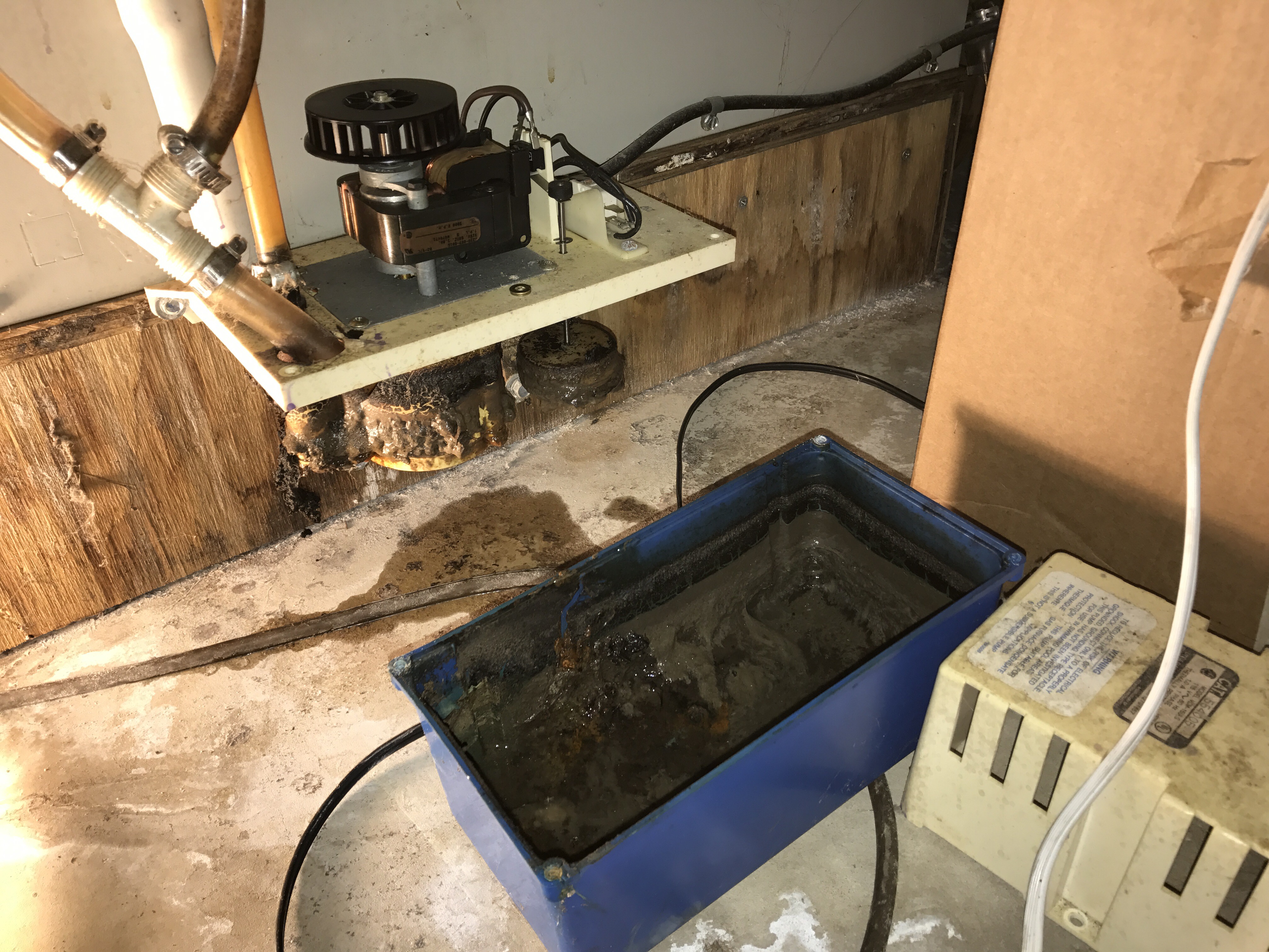 So, after taking some cues from an actual heating & air guy, I found the possible culprit that had led to lots of water on the basement floor – a corroded pump.