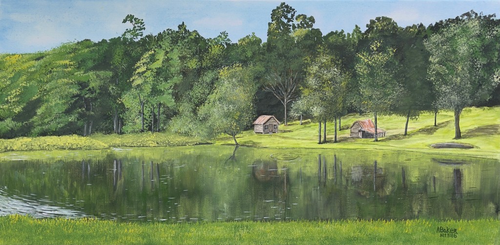 However, a recent painting I completed for a client (a commissioned work) has stirred a lot of response. On one Facebook page it’s garnered over 2,100 likes and 631 comments! It is a painting of an actual pond in Sandersville, Georgia, called Doolittle Pond. If you Google it you will find it on just about any Georgia map.