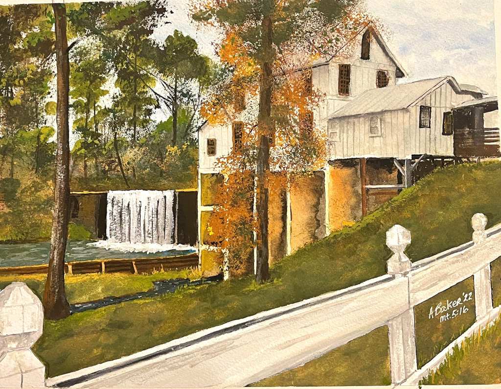 The painting is of the south side of the pond where a couple of old structures dating back to the 1800’s still stand. The actual property is a little more wooded and shady, but he wanted me to “clean up” the view so that the buildings could be seen clearly.