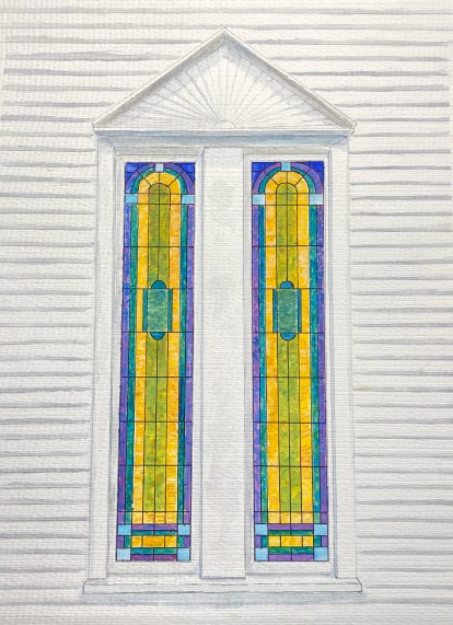There are multiple drawings, paintings, and photos of Bethlehem Baptist Church, but hardly anyone has focused on just the stained glass window in the front. The original painting is on 11 x 15 cold press paper.